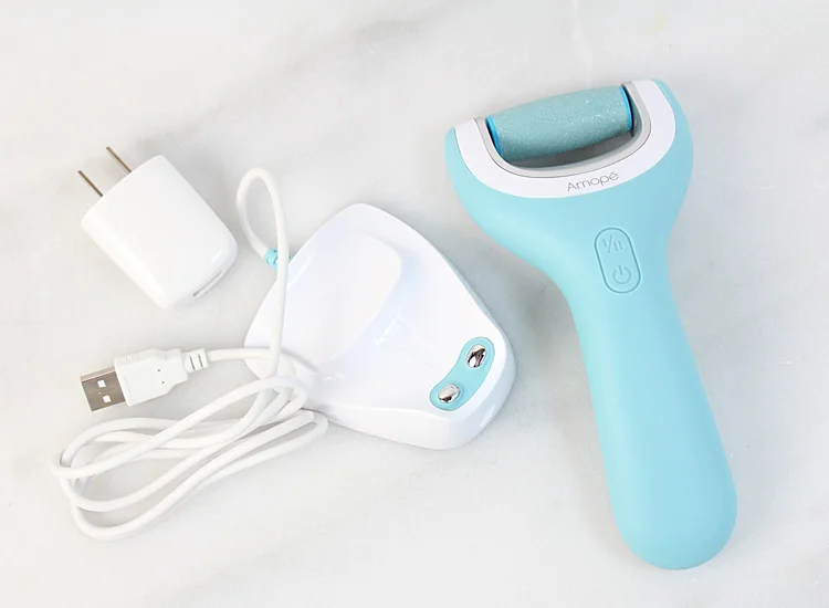 After fully charging the Amopé Wet & Dry Foot File in the charging dock, it's rechargeable which is so convenient, I get to work on my feet. There are two speeds— for dry skin, use the low speed; for wet or extra tough skin, use the high speed. It's important to use the tool on the feet gently. Glide the roller head over skin for no longer than 3 to 4 seconds in one area. If you apply too much pressure, the unit will stop. Be careful! Watch with amazement as you continue to go over your feet, continuing to glide the tool over your skin and watch your dead skin exfoliate. It's pretty cool! Skin is left silky soft in a matter of minutes. It really is the best thing that has happened to my feet.