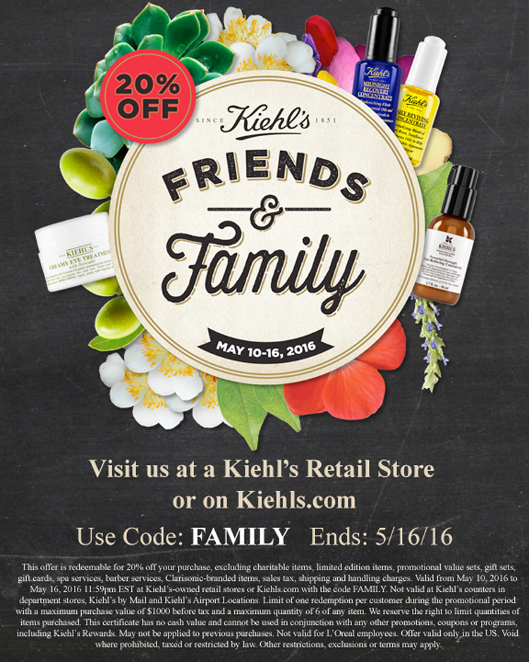 You can save 20% off on all Kiehl's products now through 5/16/16 with the code: FRIENDS at all Kiehl's US boutiques and online at kiehls.com.