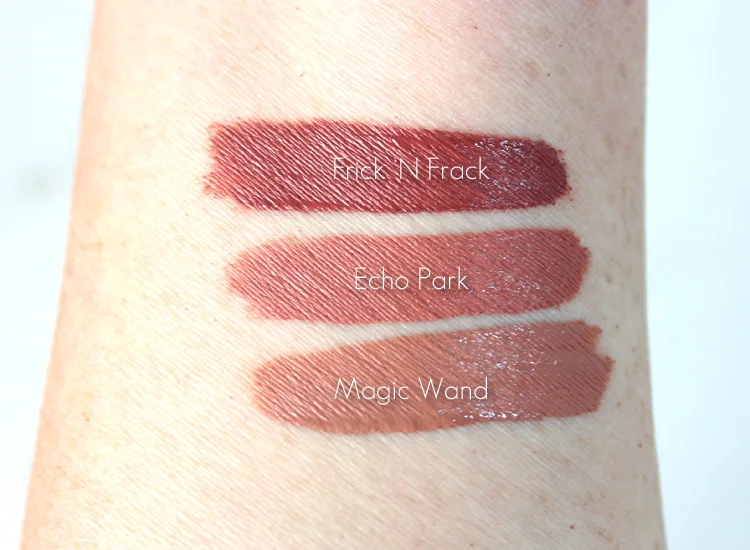 Magic Wand is a dark nude lip color. Echo Park takes that nude shade and kicks it up just a notch and adds a little bit of peachy color to it. Frick 'N Frack is a very dark burnt rose shade.