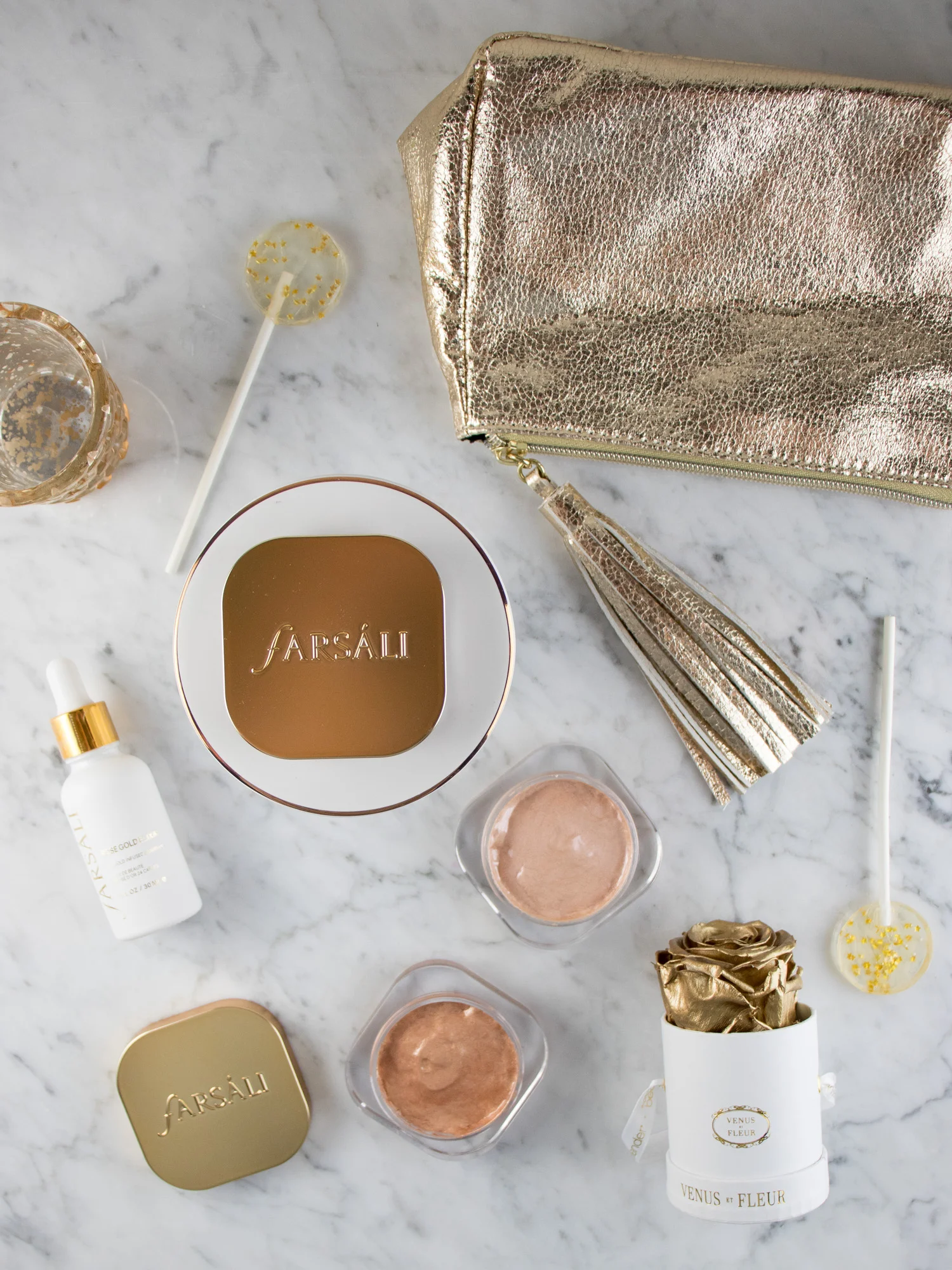 Buy FARSÁLI Rose Gold Elixir and Jelly Beam Highlighters at the farsali.com website or Sephora.com.