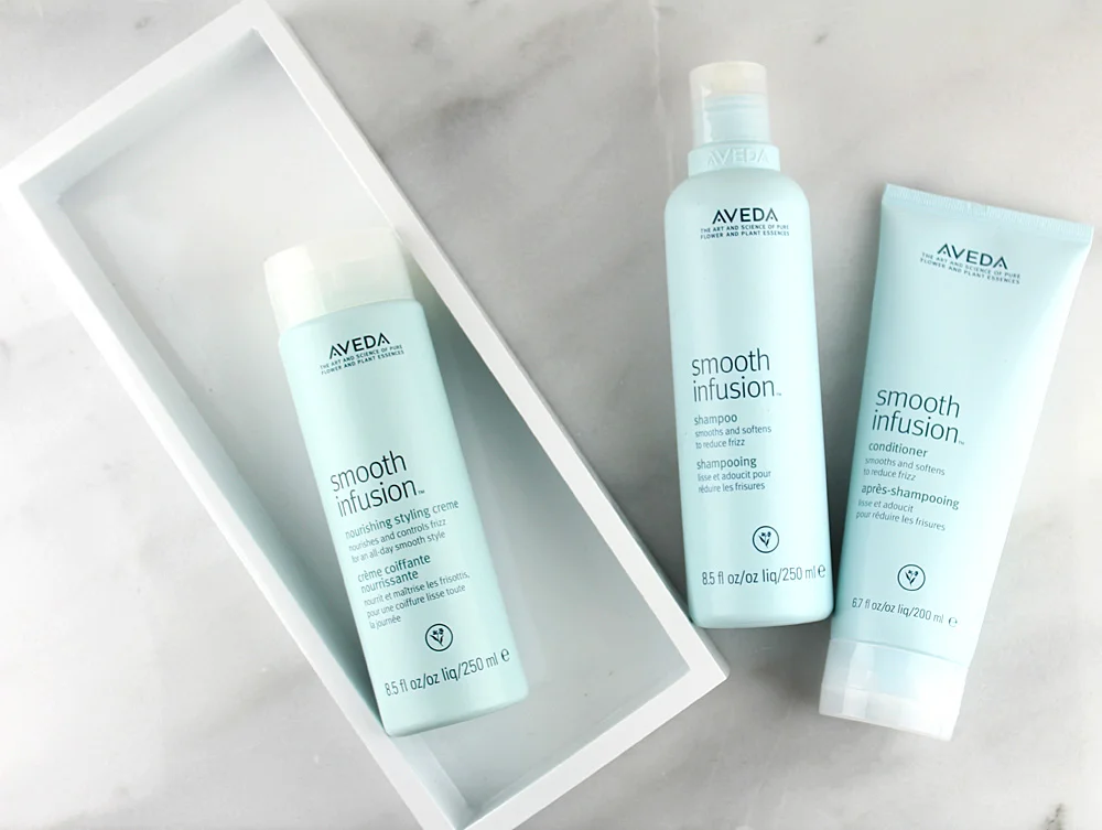 I've been using the Aveda Smooth Infusion Shampoo, Smooth Infusion Conditioner and Smooth Infusion Nourishing Styling Creme and it has made such a difference. This trio cut down the frizz and overall bulk of my hair. You know when moisture penetrates the cuticle of the hair, frizz happens and the hair expands making it big and bulky. Overtime, I have noticed that my hair has become more smooth overall, with little to no frizz, even in high humidity. I can go a few days without washing, and simply smooth a bit of the Styling Creme into my hair to control and flyaways or frizz.