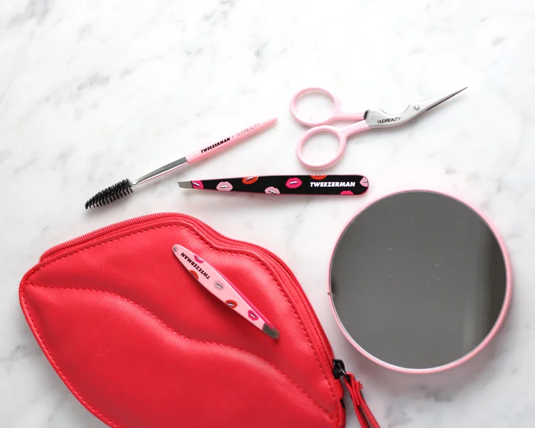 This kit contains the Slant Tweezer, Brow Scissors, Spoolie, Mirror and an adorable lip-shaped cosmetic bag.