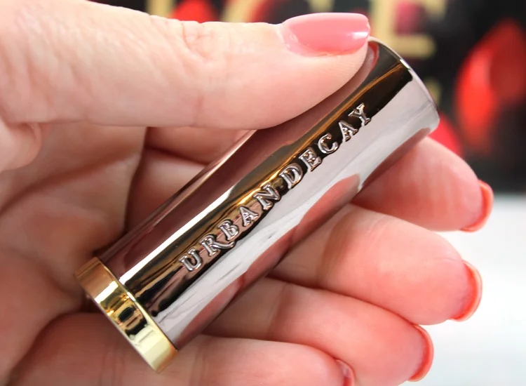 Vice Lipstick comes in an updated, modern version of their original case, called a lipstick bullet. Although it is new, it definitely speaks to the brands roots. It's very luxe with a gunmetal finish and gold base with Urban Decay lettering on the side. The bottom of each bullet contains a label in the color of the shade with the shade name. Super smart!