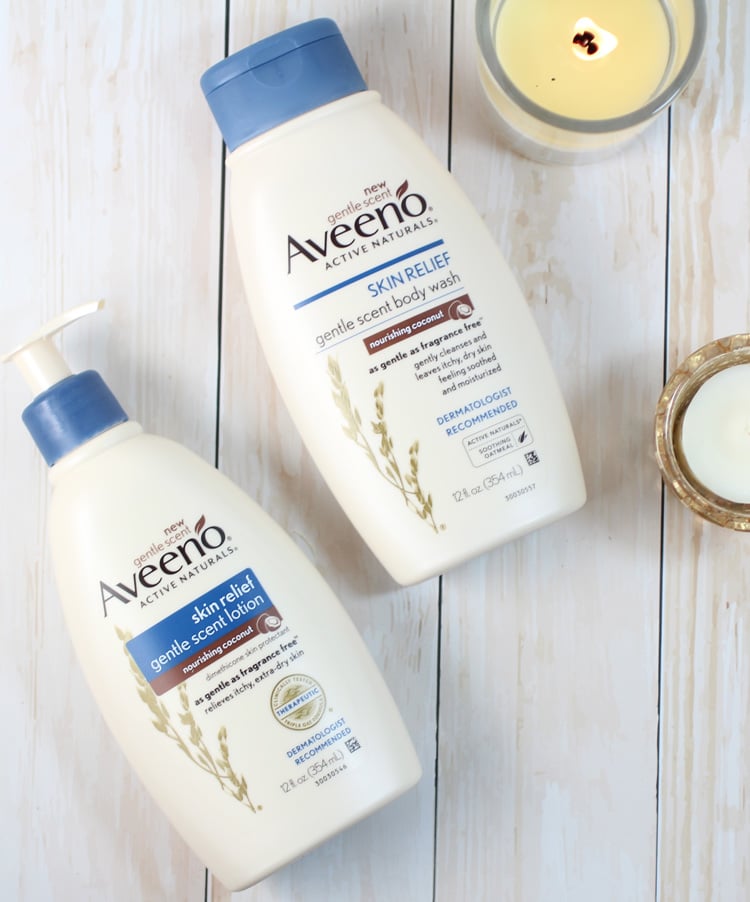 The AVEENO Skin Relief Gentle Scent™ Collection includes two scents: Nourishing Coconut and Soothing Oat and Chamomile and both scents have been thoroughly tested and proven to be just as gentle on the skin as the fragrance-free alternatives. The Skin Relief Gentle Scent™ Lotion and Skin Relief Gentle Scent™ Body Wash are both formulated with ACTIVE NATURALS® Oat and nourish the skin to provide relief to soothe itchy, extra-dry skin.